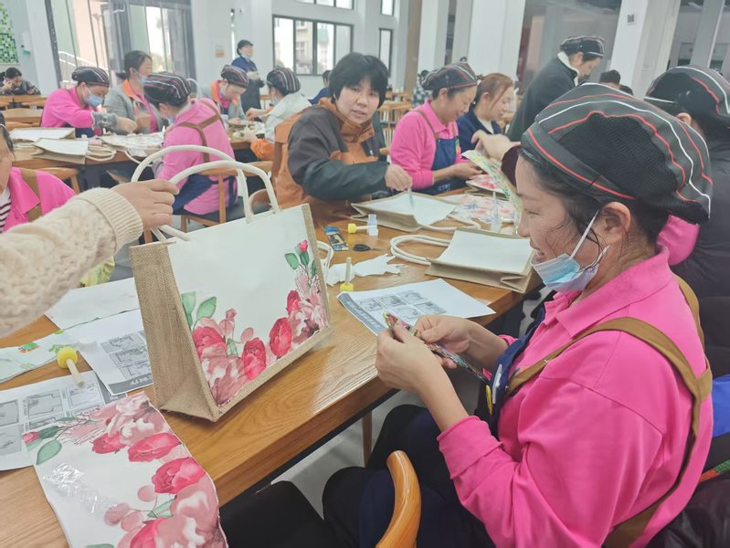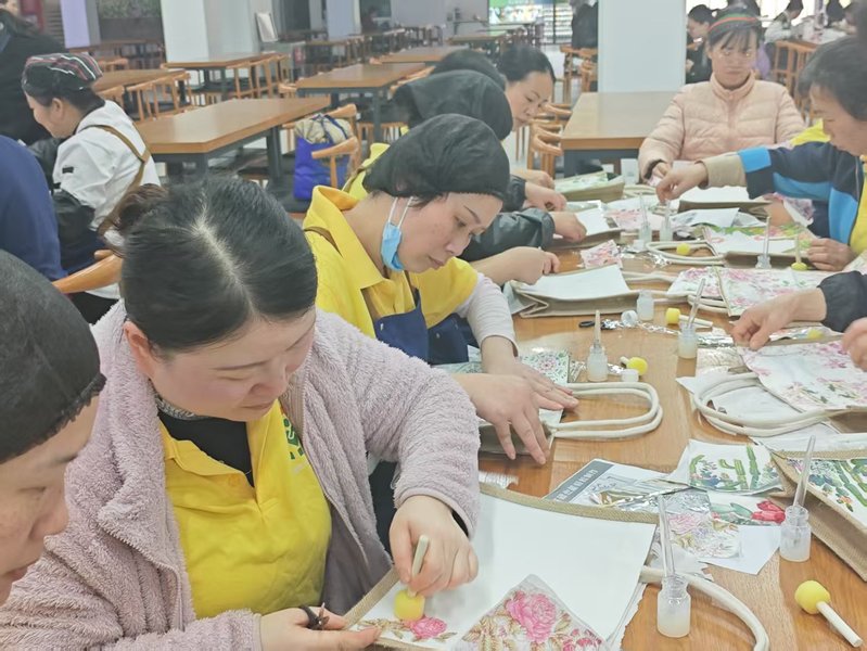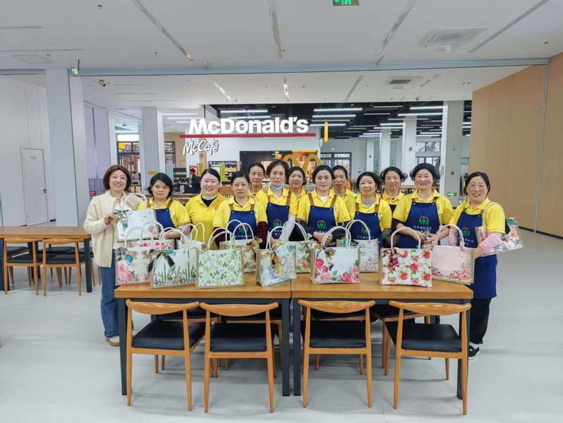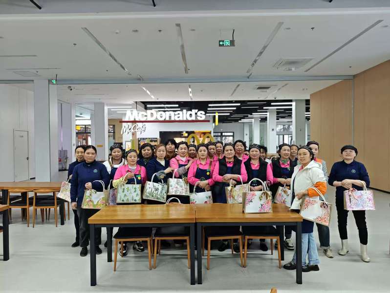 中午时分,江宁校区北苑餐厅内欢声笑语不断。活动现场,素色环保布袋、印有花卉与抽象图案的装饰布料、剪刀及胶水等材料整齐摆放。女员工们充分发挥创意:有人参照模板裁剪完整图案,精心粘贴;有人则将图案拆分重组,设计出独具匠心的拼贴作品。大家相互交流灵感,遇到难题时彼此协助,氛围温馨融洽。转眼间,素净的布袋便“华丽变身”——娇艳的玫瑰、蓬勃的仙人掌、抽象的艺术画跃然其上,每一件作品都承载着巧思与心意。
